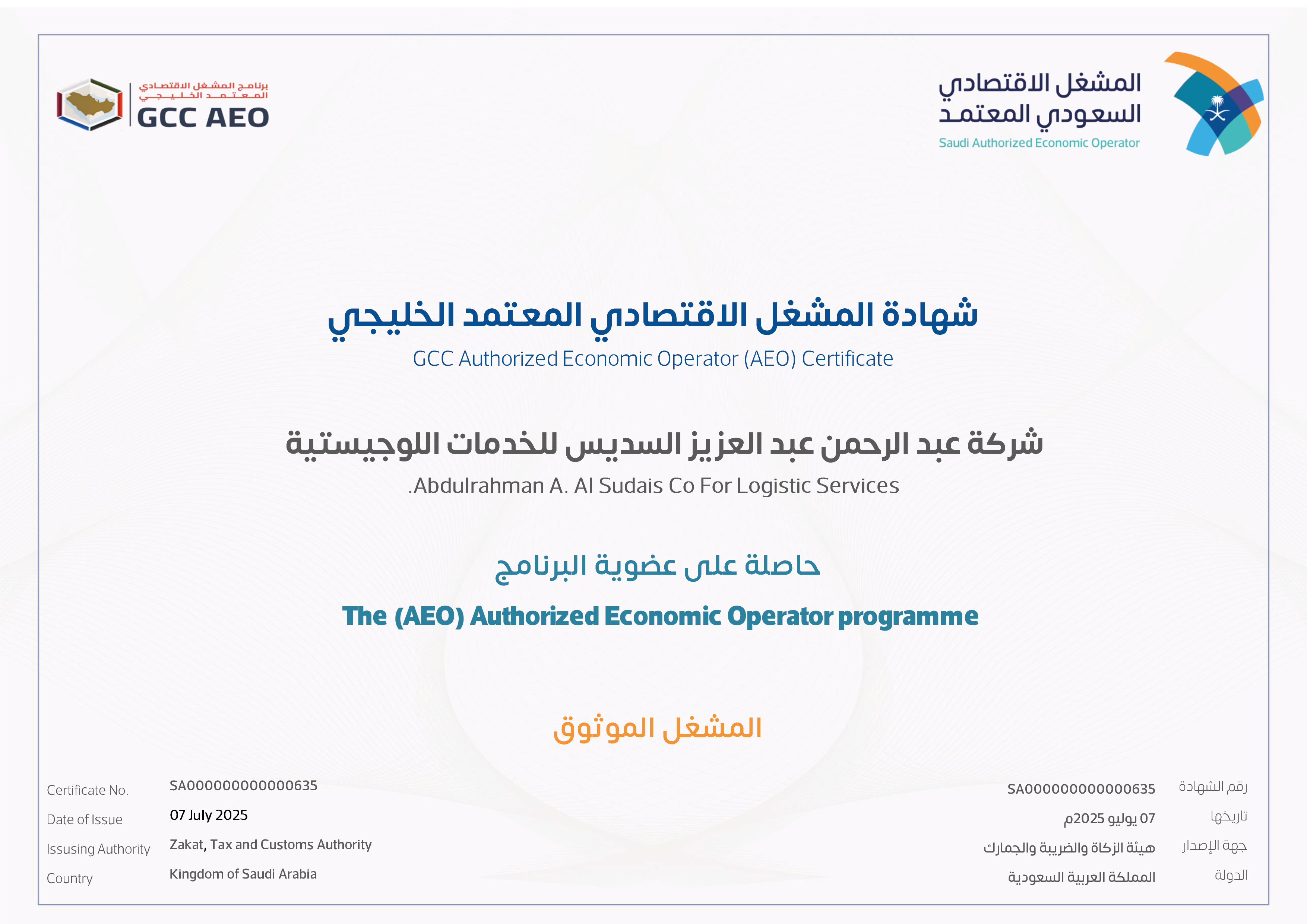 حصلت شركة عبدالرحمن عبدالعزيز السديس للخدمات اللوجستية على شهادة المشغل الاقتصادي المعتمد (AEO) الصادرة عن هيئة الزكاة والضريبة والجمارك، تقديرًا لالتزامها بأعلى معايير الامتثال الجمركي والأمني وجودة الأداء في قطاع الخدمات اللوجستية.